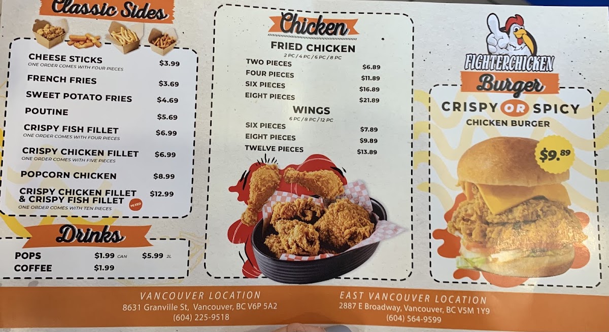 - Sides: A range of accompaniments such as popcorn chicken, chicken tenders, poutine, onion rings, French fries, and wraps including chicken and fish options. These sides provide additional choices for a more complete meal.